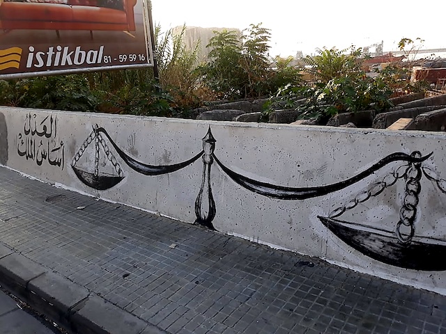 On observe une double énonciation avec ces deux messages réclamant la justice, puisqu’ils sont accompagnés d’un même dessin : le symbole de la justice, représenté, dans le premier, par la déesse grecque de la justice tenant une balance, et, dans le second, par la balance. Normalement, la balance est utilisée comme symbole de justice dans les institutions officielles libanaises. Il est intéressant de noter que la Marianne de la justice est un symbole plus utilisé en France dans les institutions gouvernementales :
