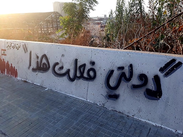 Après l’explosion du port, le 4 août, des Libanais ont manifesté leur colère le 8 août devant les institutions gouvernementales, se heurtant aux forces de sécurité. Le jour suivant, un message en anglais est apparu sur l’autoroute. L’usage de l’anglais, langue internationale, vise à attirer l’attention du plus grand nombre, notamment des visiteurs étrangers, afin de faire passer le message iconographique. Après l’effacement du message par l’État libanais, le 8 avril 2021, des révolutionnaires l’ont réécrit le même jour, en ajoutant la phrase : « Vous ne pouvez pas effacer votre crime : “Mon État a fait cela” ».