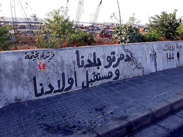 Les trois messages, qui veulent dire exactement la même chose, sont construits de la manière suivante : l’émetteur ayant rédigé son message en arabe affirme son identité en tant que citoyen libanais directement concerné par l’explosion du port de Beyrouth, comme en témoigne l’emploi du déterminant possessif « mon ». Il a non seulement adapté le registre de langue à son destinataire principal — l’État libanais et le peuple libanais — mais il s’adresse également, de manière plus large, au monde arabe, arabophone et musulman. De son côté, l’émetteur ayant choisi l’anglais cherche à toucher un public international, l’anglais étant une langue largement répandue à travers le monde. Ce message revêt ainsi une dimension transfrontalière, évoquant, par son ton accusateur, la célèbre lettre « J’accuse… ! » d’Émile Zola3 Ici, l’auteur pointe clairement du doigt l’État libanais, désigné comme seul responsable de la tragédie du port. Il a rédigé son message à la main, en noir, sur le mur d’une autoroute surplombant le port, et emploie le démonstratif « cela » pour désigner, de manière directe, l’ampleur des dégâts causés par l’explosion. En résumé, le message incrimine l’État de manière explicite en l’accusant d’être à l’origine de la catastrophe.