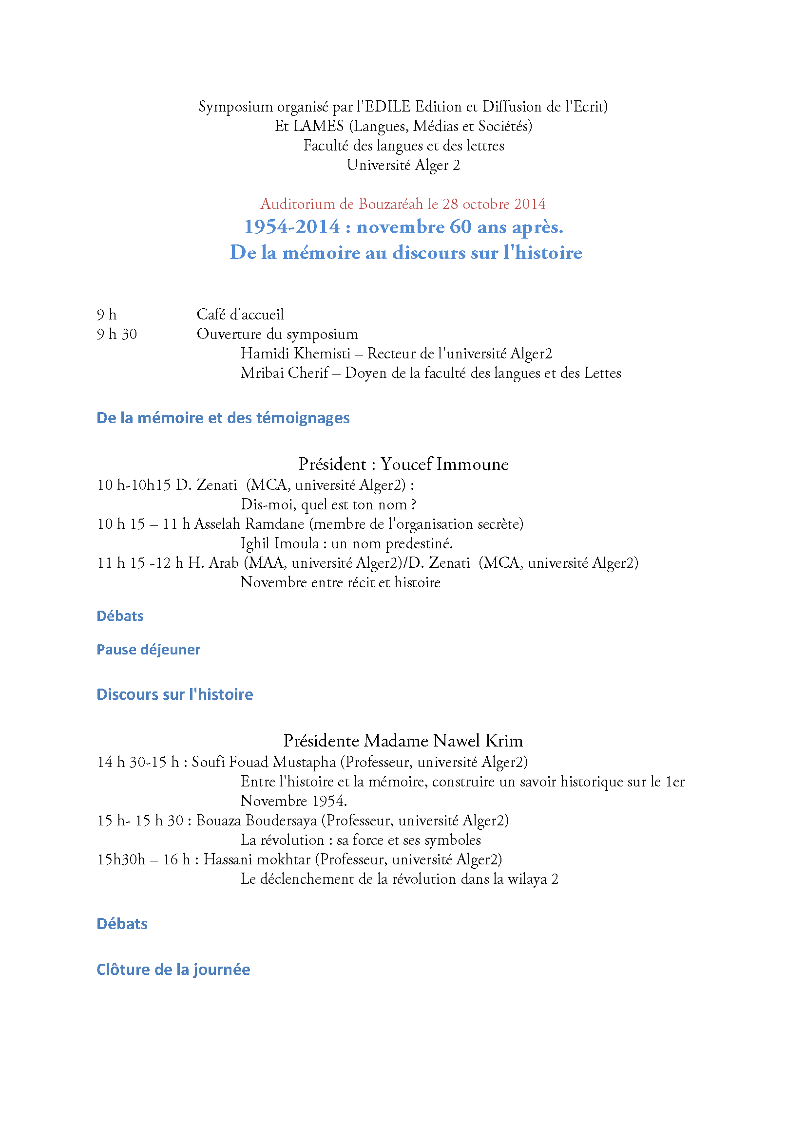 Vol.1 (1) | 2014 : 1954-2014 : 60 ans et Après. De la mémoire au discours sur l’histoire >1954-2014 : 60 ans après Programme du symposium Fichier original programme_du_symposium_du_28_octobre.png (image/png – 58k)